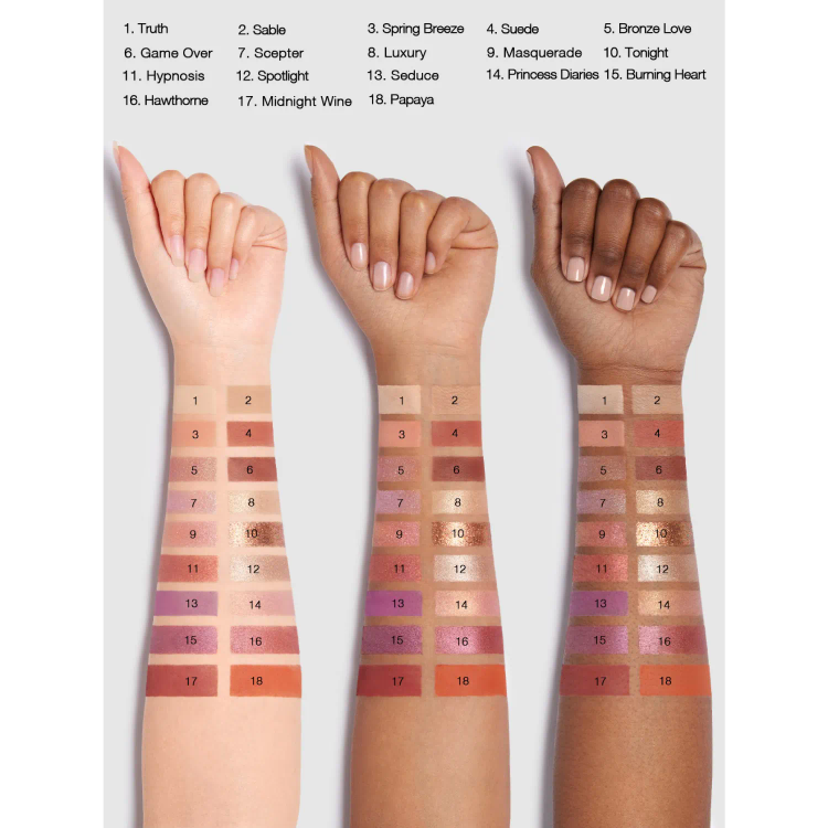 بافت سایهها کاملاً حرفهای است—نرم، پودری-کرهای، بدون ریزش اضافه و با پیگمنت قوی. رنگهای انتقالی گرم و نود موجود در ردیف اول، پایهی عالی برای هر نوع میکاپ میسازند؛ رنگهای شاین طلایی، یاسی و رزگلد ردیف دوم جلوهای لوکس و چشمگیر ایجاد میکنند؛ و رنگهای تیرهتر ردیف سوم برای ساخت اسموکیهای بنفش، قهوهای یا ترکیبی کاملاً مناسباند.