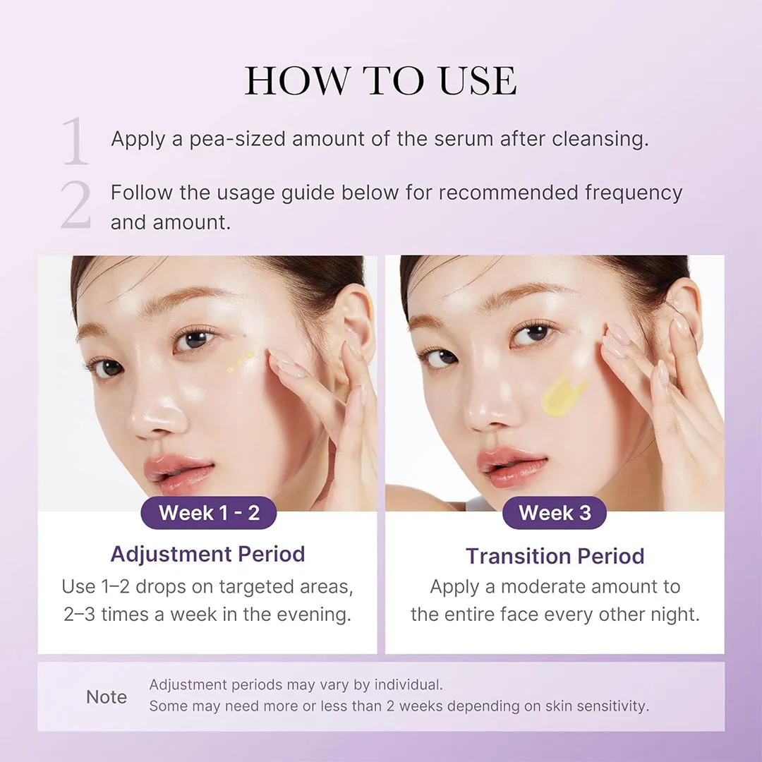 در شب، پس از پاکسازی و استفاده از تونر، ۲ تا ۳ قطره از سرم را روی پوست خشک صورت پخش کرده و بهآرامی ماساژ دهید. در روز بعد حتماً از ضدآفتاب استفاده شود. برای پوستهای حساس، استفادهی یک شب در میان توصیه میشود.