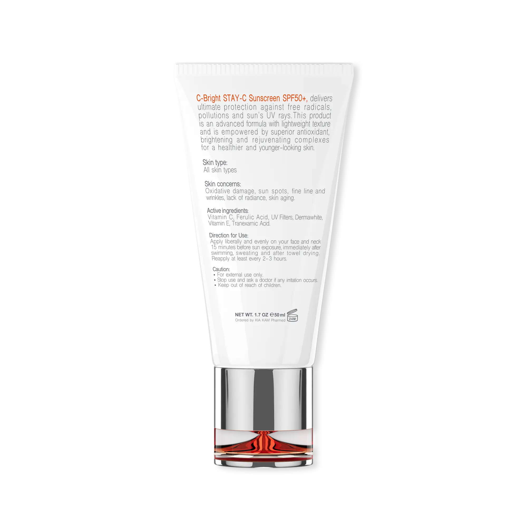 زمانی که در فرمولاسیون یک ضد آفتاب با طیف گسترده از ویتامین C استفاده میشود، مراقبت حداکثری در برابر اشعه های مضر خورشید ممکن میشود. ویتامین C باعث کاهش چین و چروک های پوست صورت و گردن میشود. به صورتی که پس از استفاده منظم روزانه از این محصول بهبود وضعیت کلی ظاهر پوست حاصل میشود. خاصیت آنتی اکسیدانی ویتامین C در ترکیب با ویتامین E افزایش مییابد.
