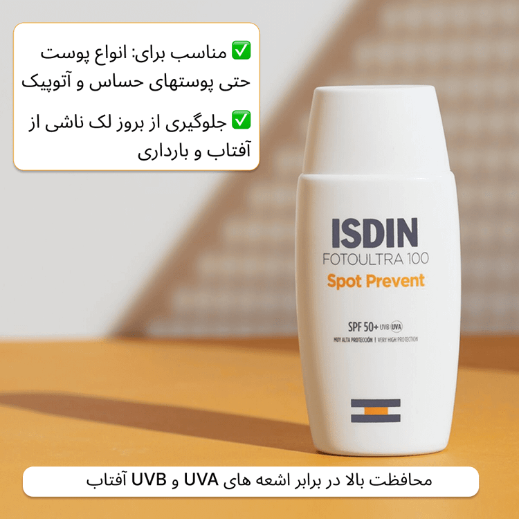 ویژگی ها: ضدآفتاب +SPF50و ضدلک بی رنگ - جلوگیری از اشعه مضر UVB ,UVA - مناسب انواع پوست و پوست جساس پیشگیری از لک های ناشی از آفتاب -بافت سبک فلویید